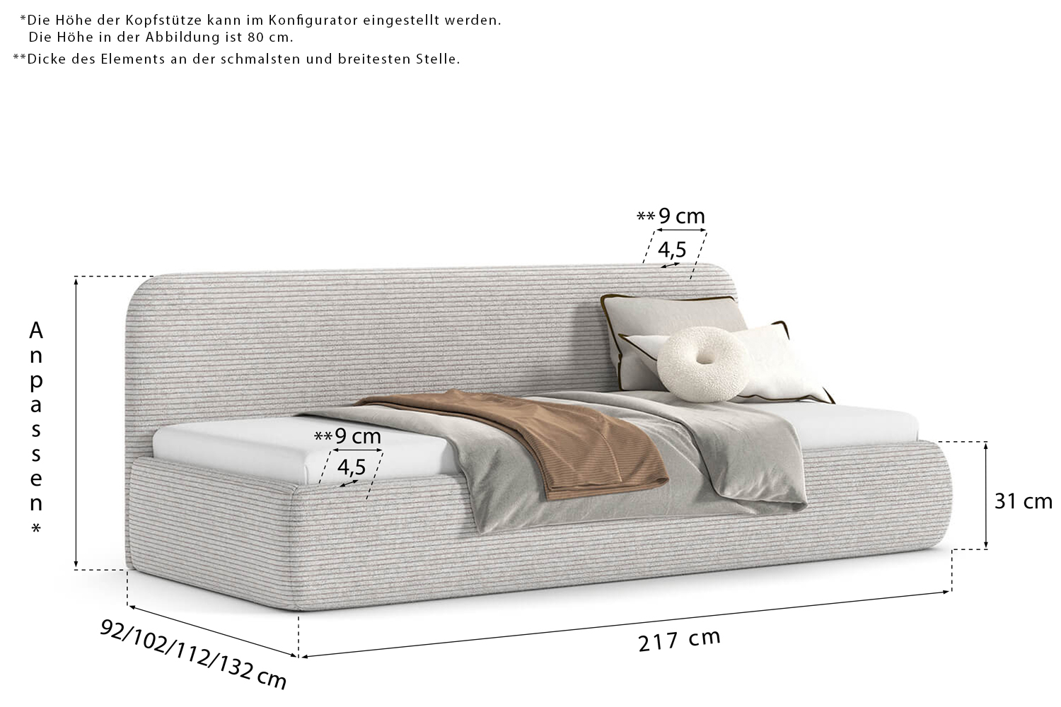 Die angezeigten Maße können durch Auswahl einer anderen Liegefläche im Konfigurator geändert werden.