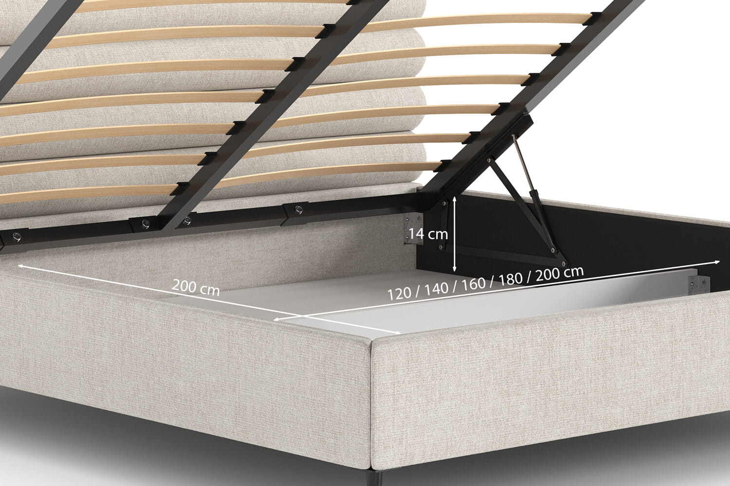 Der praktische Bettkasten in unseren Betten bietet zusätzlichen Stauraum. Ideal für Bettwäsche, Kissen und andere Gegenstände – für ein aufgeräumtes Schlafzimmer. Hergestellt aus langlebigen Materialien, ist er leicht zu bedienen und besonders benutzerfreundlich.