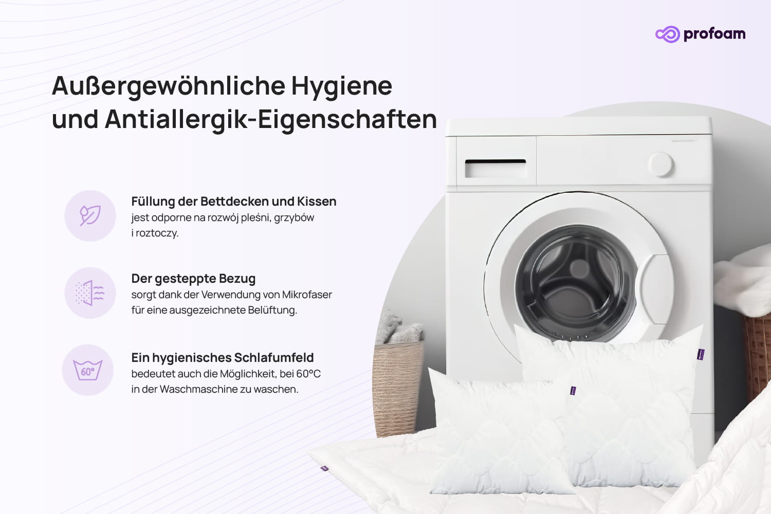 Die Füllung der Bettwaren ist resistent gegen das Wachstum von Schimmel, Pilzen und Hausstaubmilben und garantiert so eine hygienische Schlafumgebung. Darüber hinaus sorgt der gesteppte Bezug für eine hervorragende Belüftung, so dass die Bettwäsche stets trocken bleibt und bei 60 °C gewaschen werden kann.