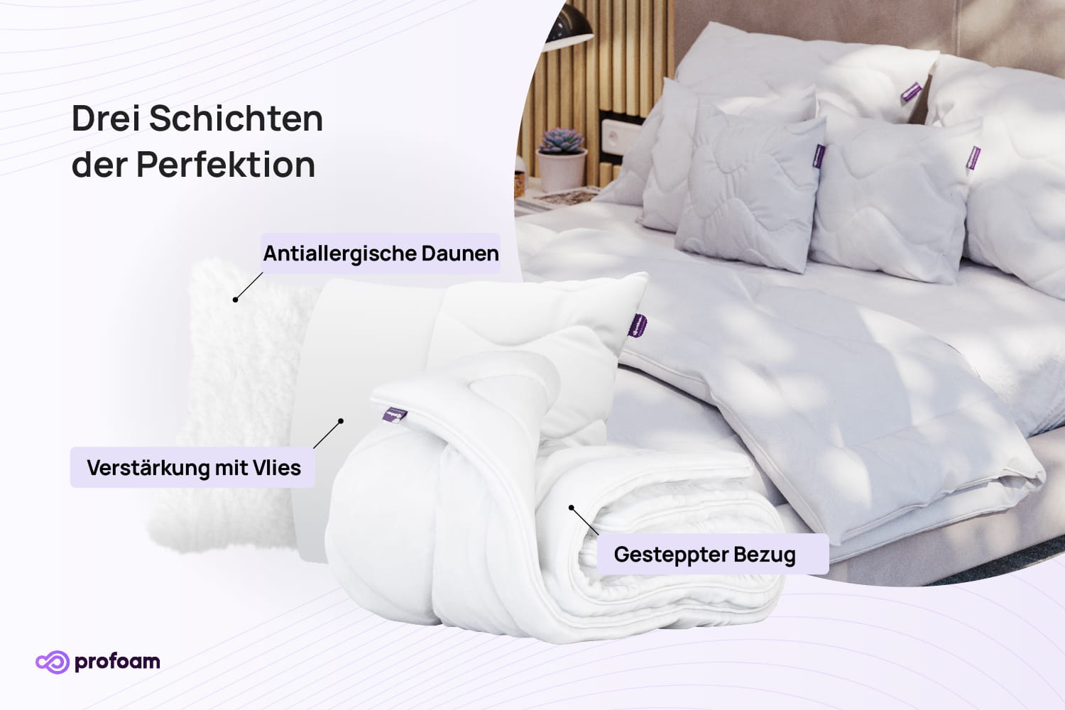 Die ideale Füllmenge in jedem Profoam-Kopfkissen und jeder Bettdecke sowie die Vielfalt der Produkte bieten für jeden Geschmack etwas. Darüber hinaus ist das gesamte Bettwarenprogramm auf höchsten Komfort ausgelegt.